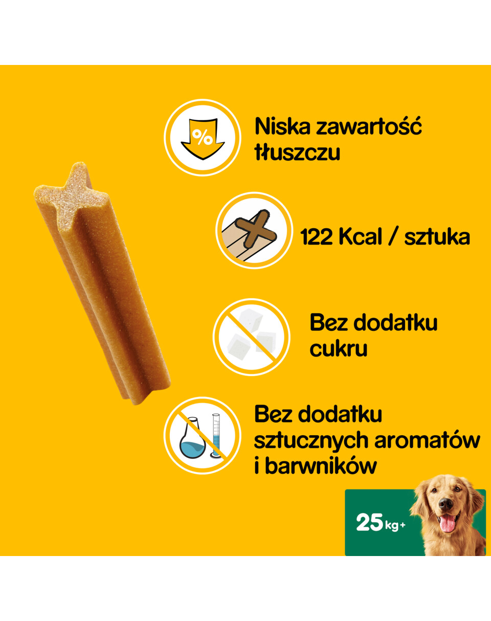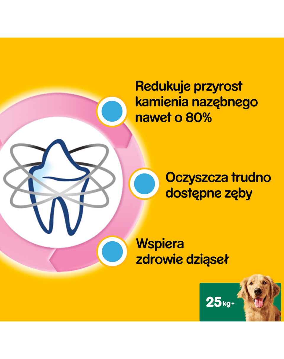 PEDIGREE DentaStix Daily Oral Care on maiuspalad koerte hambakivi moodustumise vähendamiseks. Nende ainulaadne kuju aitab puhastada isegi raskesti ligipääsetavaid hambadevahelisi kohti. Spetsiaalne koostis, mille järgi PEDIGREE® DentaStix on välja töötatud, mitte ainult ei eemalda teie koera hambakivi, vaid tugevdab ka tema igemeid. See suurus sobib suurtele koertele, kes kaaluvad üle 25 kg ja on vanemad kui 4 kuud.