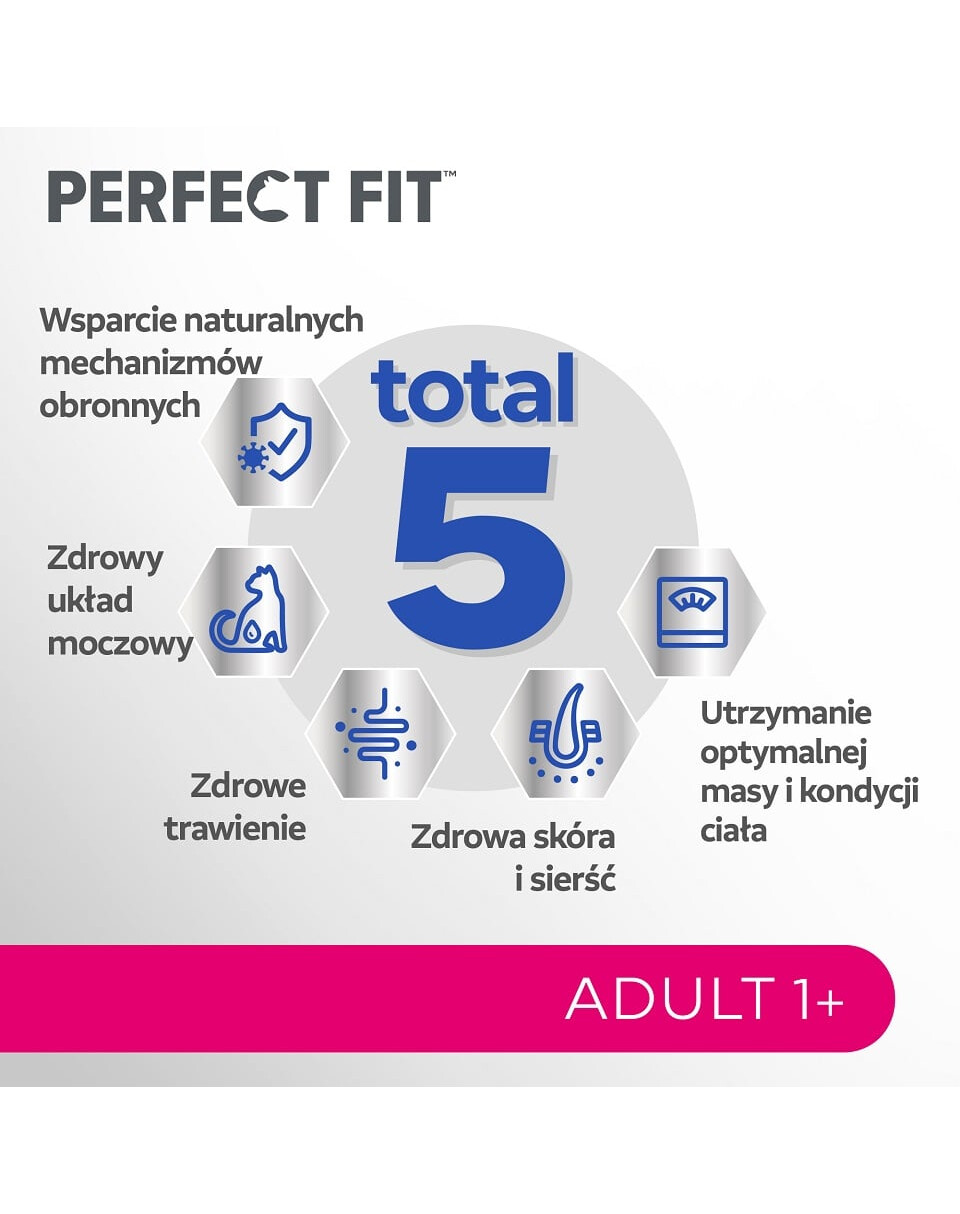 Maitsev toit Perfect Fit Adult 1+ rikkalik värske lõhega sisaldab ainulaadset Total 5 valemit, mis toetab 5 kõige olulisemat täiskasvanud lemmiklooma tervise valdkonda: toetab tugevat immuunsüsteemi, tervislikku seedimist, tervet kuseteed, tervet nahka ja karva ning aitab säilitada optimaalset kehakaalu ja konditsiooni. Perfect Fit Adult 1+ retsept on välja töötatud koostöös veterinaaride ja WALTHAMi Loomade Teaduste Instituudi toitumisspetsialistidega, et pakkuda täiskasvanud kassidele vajalikke toitaineid. Nagu teised variandid, pakub ka Perfect Fit Adult 1+ toit, mis on rikkalik värske lõhega, täiendavaid eeliseid: toetab elujõudu ja liikuvust, tugevaid lihaseid, terveid igemeid ja hambaid ning sisaldab looduslikke prebiootikume, et hoolitseda soolestiku mikrobioomi eest. Valides selle toidu oma lemmiklooma jaoks, võite olla kindel, et Perfect Fit ainulaadne valem toetab teie kassi kogu keha tervist ja pakub talle täiendavaid tervise eeliseid, mis on spetsiaalselt kohandatud tema vanusele ja individuaalsetele nõudmistele.