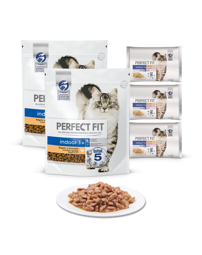 PERFECT FIT (Indoor 1+) 2 x 750g Turtinga vištiena - sausas maistas namuose gyvenančioms katėms + 12x85g paketėlis - šlapias maistas katėms padaže (su vištiena ir žirneliais, su lašiša ir morkomis)
