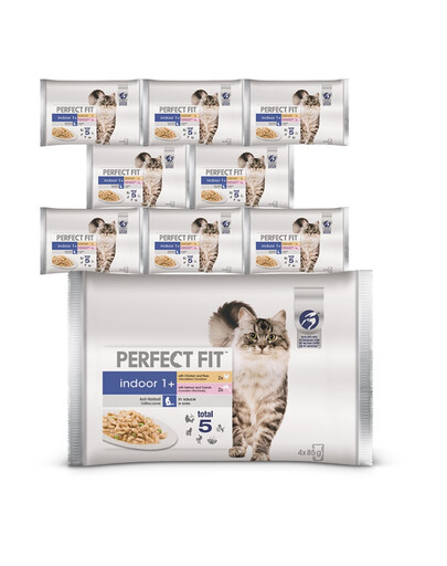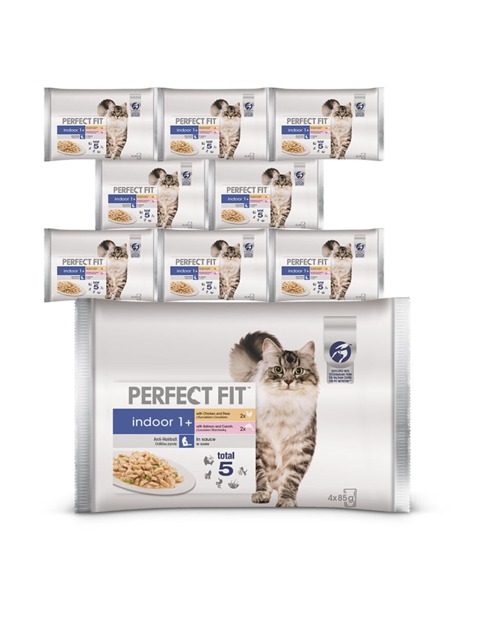 PERFECT FIT Indoor konserviai 36 x 85g -šlapias kačių maistas padaže (su vištiena ir žirneliais, su lašiša ir morkomis)