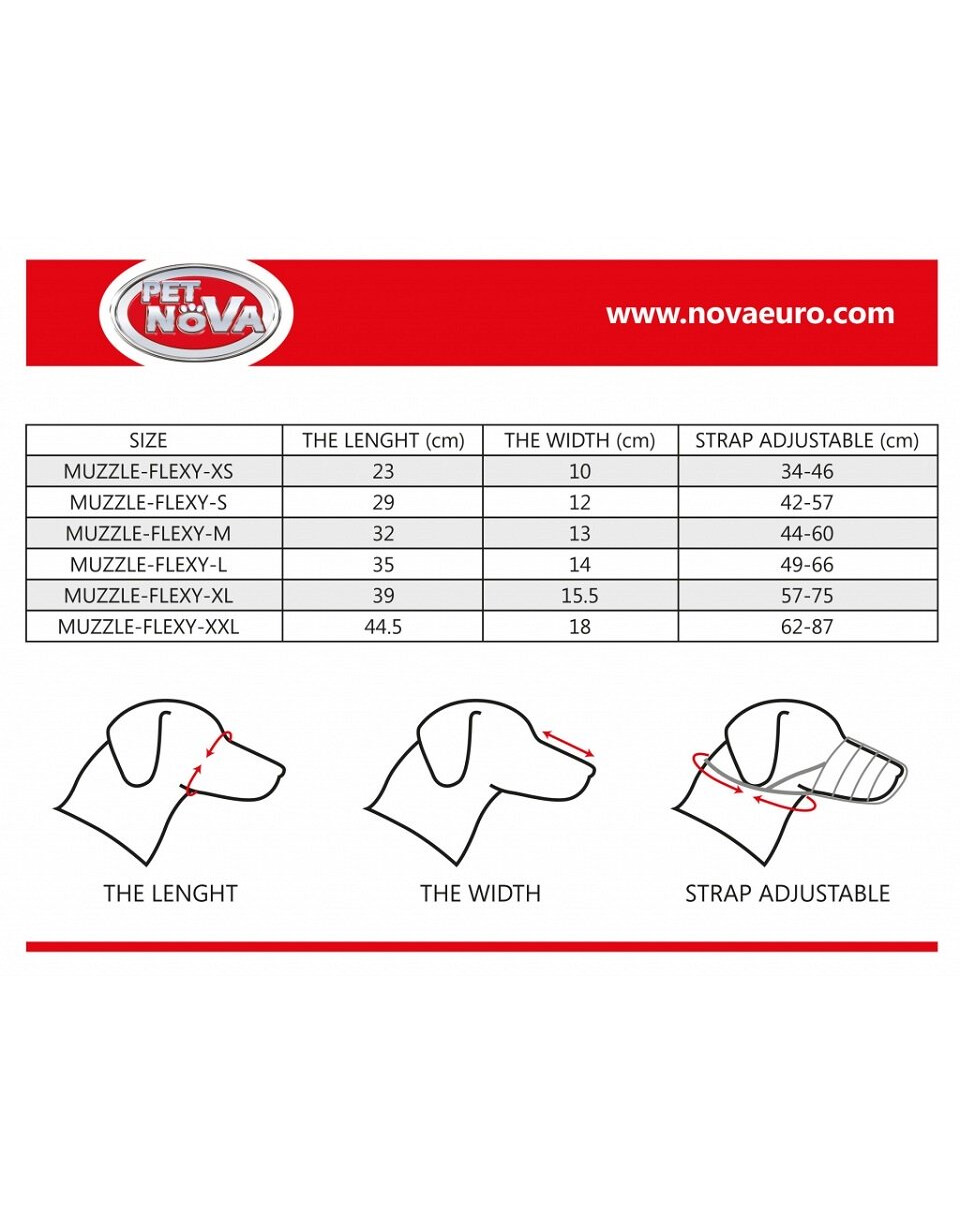 PET NOVA Flexy suukorv on valmistatud väga tugevast materjalist, samas on toode väga paindlik. Seega tagab suukorv maksimaalse ohutuse ja mugavuse, kuna koer saab vabalt juua ja püherdada. Suukorvi intuitiivse reguleerimis- ja kinnitussüsteemi tõttu on seda lihtne iga päev peale panna ja maha võtta. Suukorvid on saadaval kuues suuruses. Suurustabelit vt pildilt. On oluline, et suukorvi oleks suuruses, et koera nina ja suukorvi otsa vahele jääks umbes 1 cm ruumi.