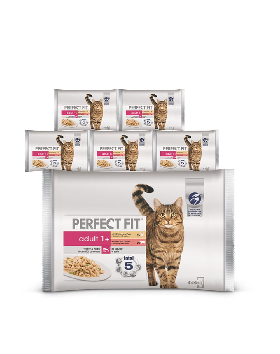 PERFECT FIT Adult konservai 24x85g – šlapias kačių maistas padaže (su vištiena ir žirneliais, su jautiena ir morkomis)