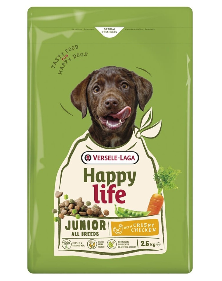 Koor Happy Life Junior Chicken on välja töötatud kutsikate ja noorte koerte vajaduste rahuldamiseks intensiivse kasvu perioodil. See on 100% täisväärtuslik ja tasakaalustatud retsept, mis pakub kõiki vajalikke toitaineid õige areng ja energiline elu.