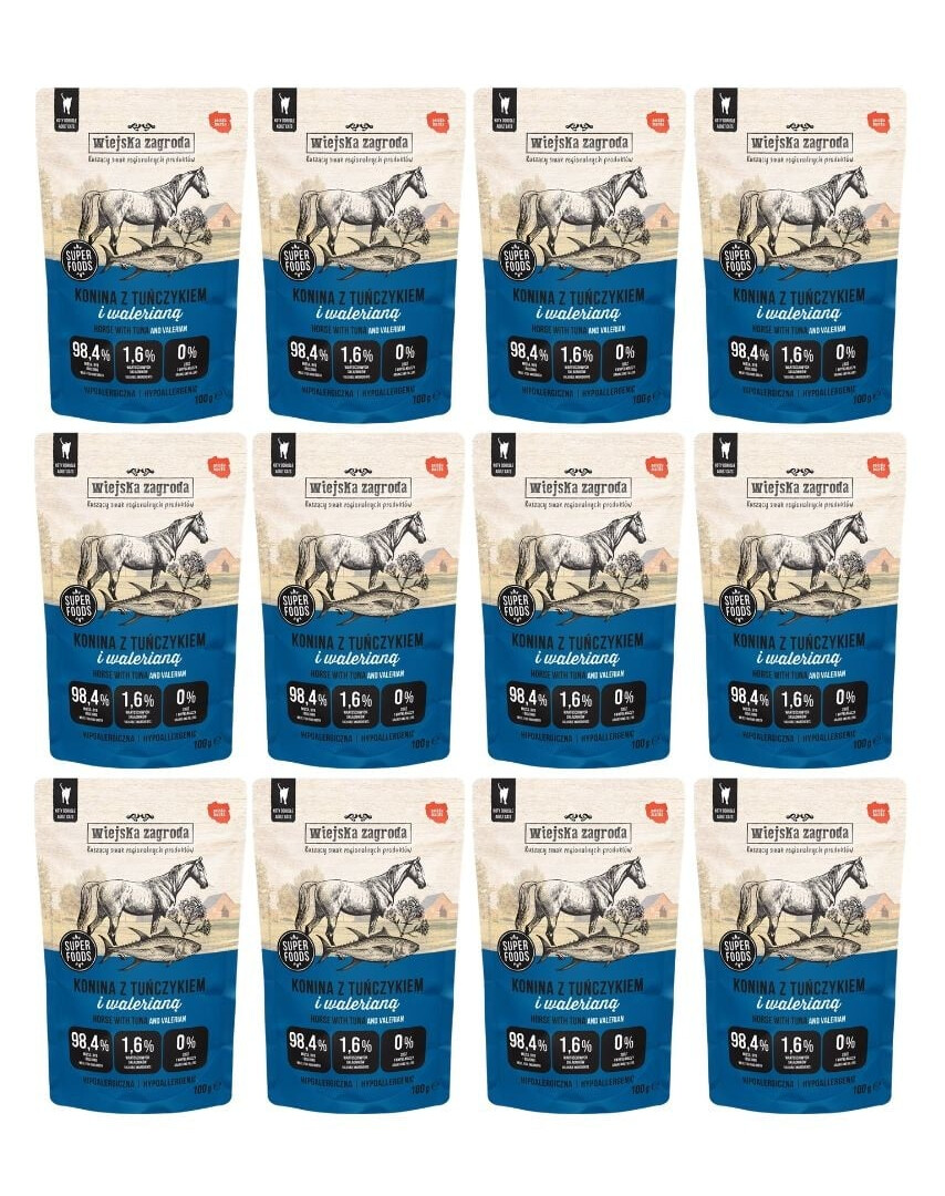Wiejska Zagroda Hobune tuunikala on koostatud spetsiaalselt kassidele, kes hindavad mitmekesiseid maitseid. Hobune on pehme, hüpoallergeenne valguallikas, mis on rikas raua ja B-vitamiinide poolest, ideaalne tundliku seedesüsteemiga kassidele. Tuunikala pakub väärtuslikke Omega-3 rasvhappeid, mis toetavad naha ja karva tervist. Spiruliina on vitamiinide, mineraalide ja antioksüdantide allikas, mis mõjutavad positiivselt immuunsüsteemi. Lõheõli annab vajalikud Omega-3 ja Omega-6 rasvhapped, parandades naha ja karva seisundit, õllepärm tugevdab immuunsust, prebiootikumid MOS ja FOS toetavad tervet soolestiku floora, ning valeriana toimib lõõgastavalt ja aitab stressi vähendada.