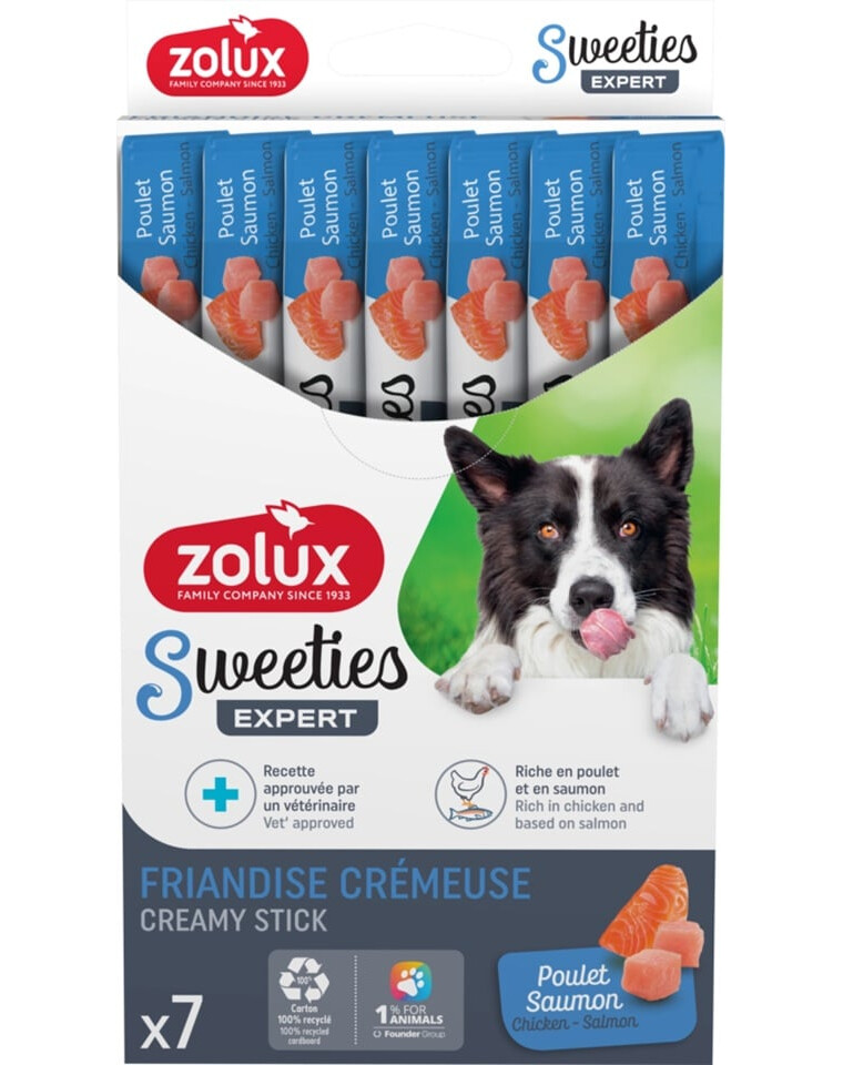 ZOLUX SWEETIES lõhe ja kanaga on kreemine maius, mis täiendab suurepäraselt teie koera igapäevast tasakaalustatud toitumist. Selle niiske konsistents toetab organismi õiget niisutamist ning lõhe ja kana kombinatsioon tagab kõrge valgu sisalduse. Tänu minimaalsetele rasvasisaldusele on maius samal ajal tervislik ja maitsev. Toode on loodud ainult looduslikest koostisosadest, ilma suhkru, kunstlike värvainete ja aromaatideta, sobib ideaalselt ka tundliku seedesüsteemiga koertele.